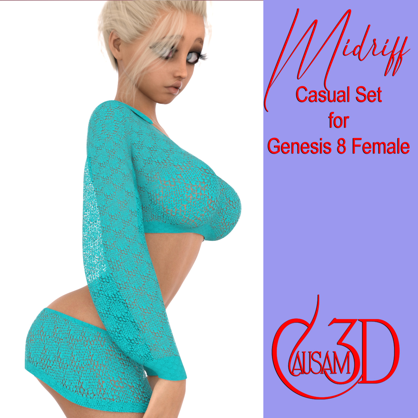 Midriff Skimpy Casual Set is the latest in the long and fine line of Causam3d skimpy casual wear! As you have come to expect from C3D, reactive dForce will insure a proper fit and look. Midriff Skimpy Casual Set features a very high waisted top and long, billowing sleeves which is constructed to conform perfectly to your character's breasts and nipples. As always with our clothing products, reactive dForce insures a perfect fit every time. The panty is a low cut design that cups your character's unmentionable in the right place only while framing her hips and buttocks in full, exactly as you would expect from racy bottom. This set exhibits all of the great conformance and fit characteristics you have come to expect from Causam3D. To install: TO USE: SIMPLE is our mantra. 1. Load the complete wearable or just the component you want onto onto your Genesis 8 female character. That's it, you're done. Included In This Package: 1 Top To find your Midriff Skimpy Casual Set: People >>> Genesis 8 Female >>> Clothing >>> Causam3D >>> Midriff |