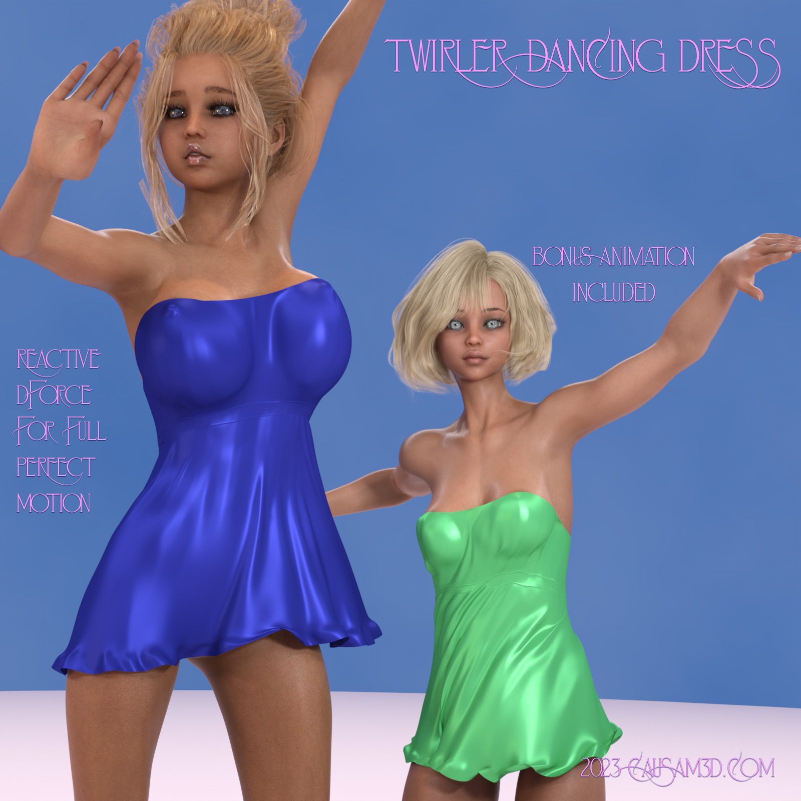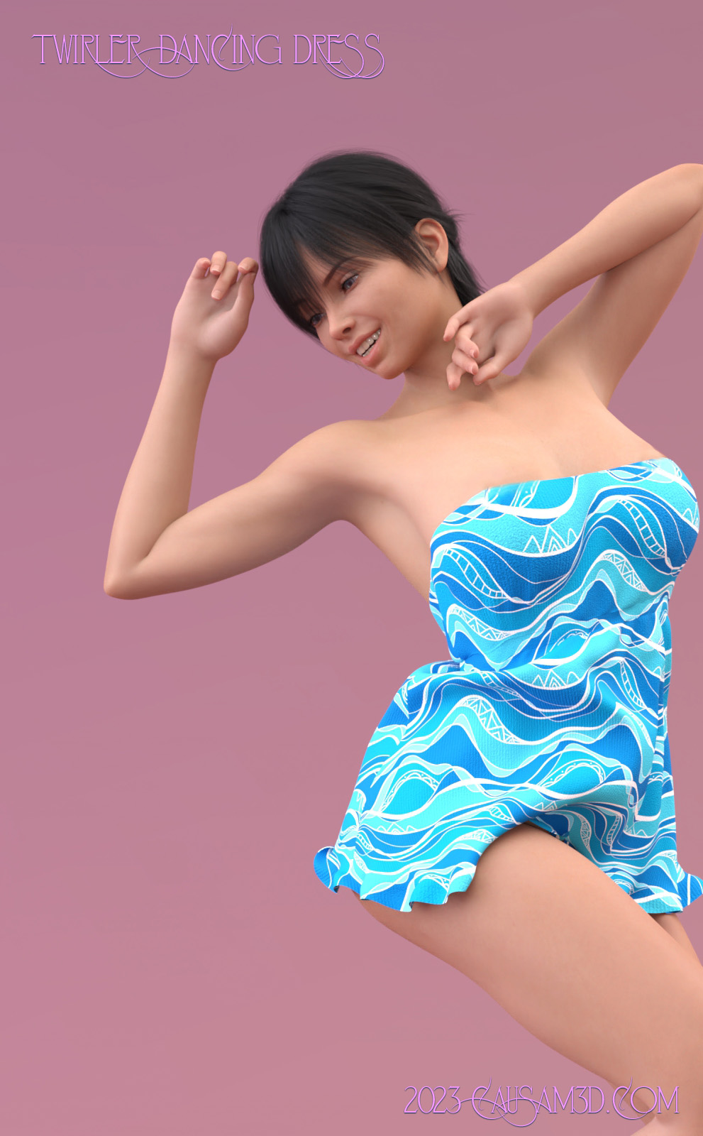 Twirler Dancing Dress for Genesis 8 Female is a short but adjustable reactive dForce dress designed from the ground up for BOTH animations and still renders. Twirler has life in it even standing still.