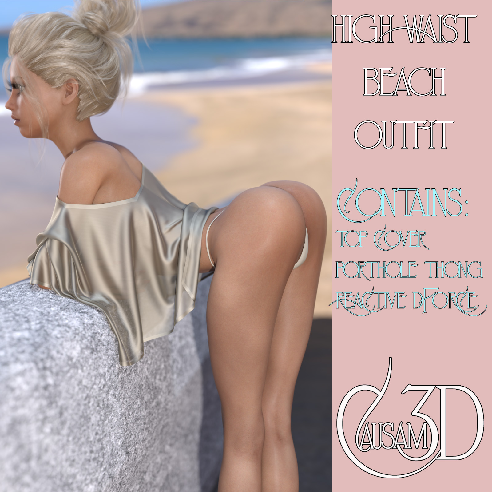 The High Waist Beach Outfit is the latest in flowing sheer designs and skimpy bottoms from Causam3D. The beachwear features a flowing form fitting silk top which is modest enough for PG renders. The High Waist Beach Outfit comes with several dForce presets to maximize your ability to make easy, beautiful renders. The top is a follower that is parented to your character's neck. You can show or hide the top with an icon provided. As always, our dForce has been thoroughly tested to insure that you don't experience any explosions. TO USE: 1. Load the desired beachwear option onto your character. 2. Pose your character. 3. Run a simulation. 4. Choose a material and RENDER! TIP: When using a dForce wind node with this beachwear, keep the wind speed to a minimum, say five or ten miles per hour and set the scene gravity to either "zero" or something very low like .05. This allows the material to flow and assume a natural shape without risking explosion or coming completely off the character. Ownership Statement: Created and owned by Causam3D |